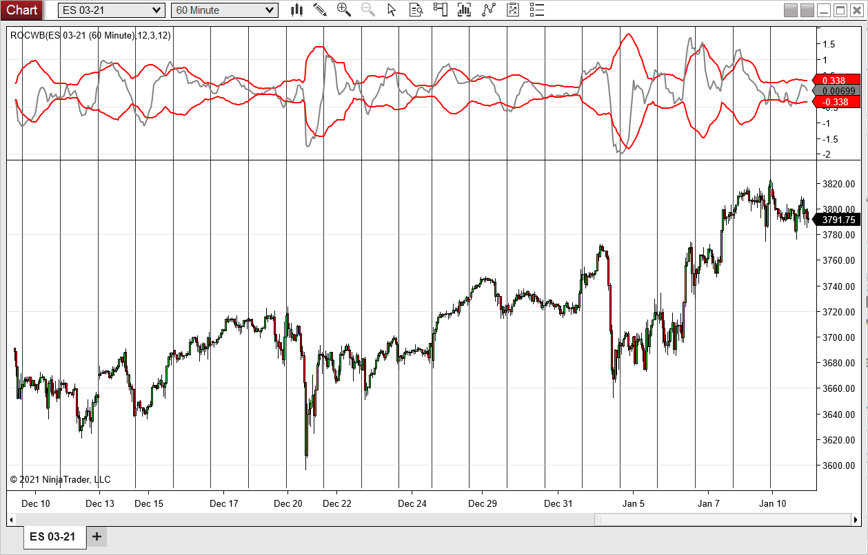 FIGURE 5: NINJATRADER. This hourly chart shows the emini S&P 500 futures (ES 03-21) with ROCWB (12,3,12) in the upper pane from December 2020 to January 2021.
