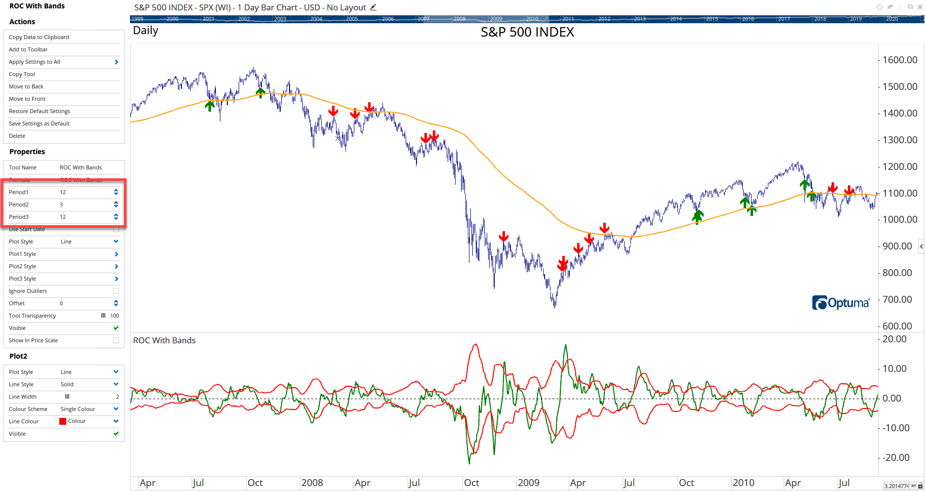 FIGURE 7: OPTUMA. This sample chart displays the rate of change bands. Parameters can be adjusted in the tool properties. Here, red and green arrows show overbought/oversold crossovers above and below the 200EMA.