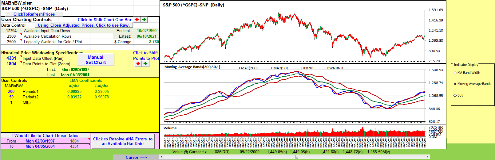 The first example system demonstrated here, which is a simple trend-following system using MA bands, is based on the premise that the moving average band boundaries can be used to help identify uptrends and downtrends: