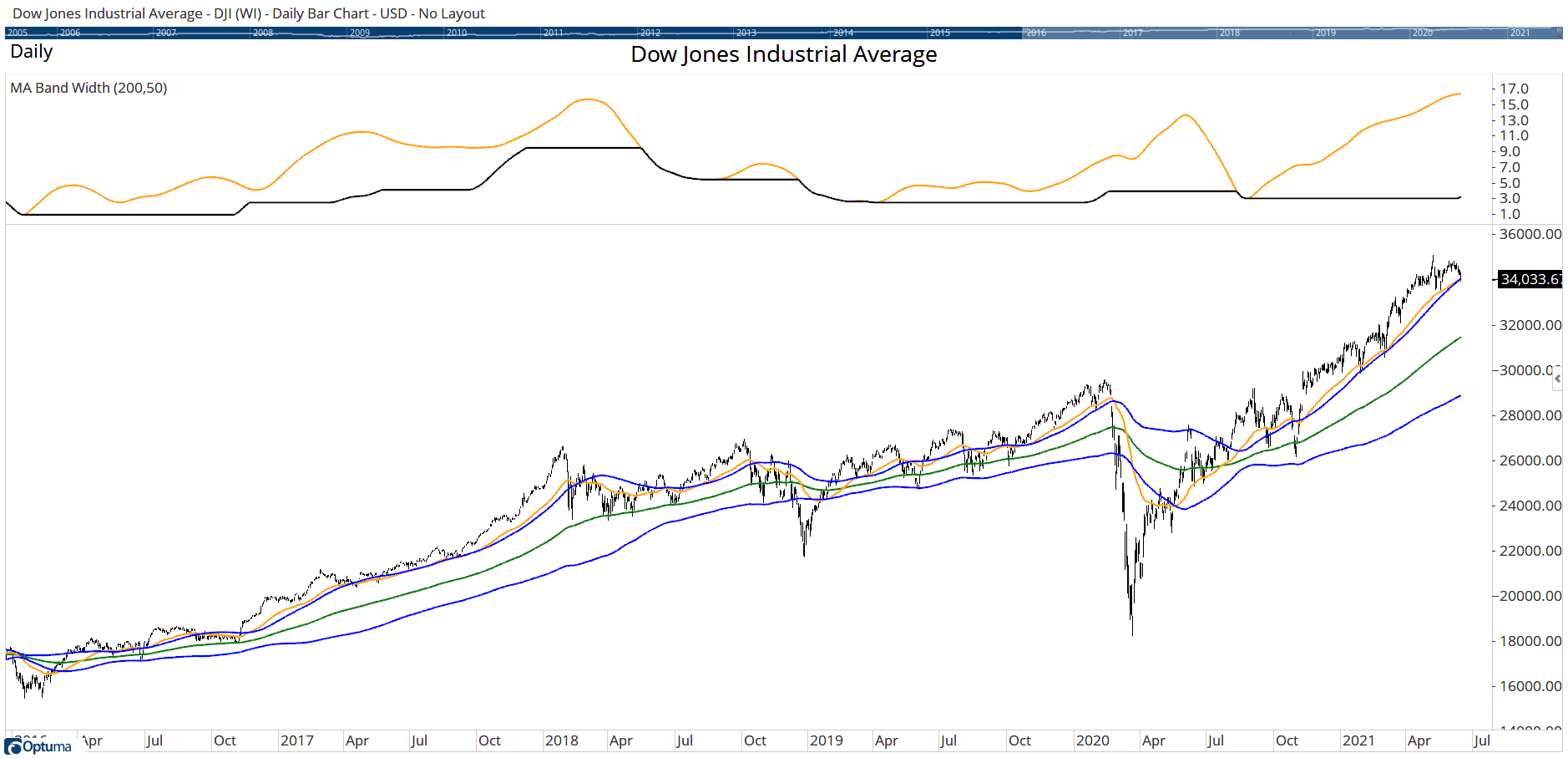 Provided here is code for use in Optuma based on the two-part article by Vitali Apirine on moving average bands and moving average band width (“Moving Average Bands,” part 1, July 2021 issue, and “Moving Average Band Width,” part 2, August 2021 issue).
