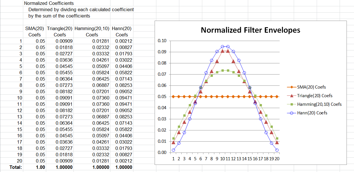 We can use the Coef-x/SumOfCoefs construct to normalize the coefficients for the different filters to the same scale and then chart them on the same graph as in Figure 14. Note that regardless of the envelope shape, the normalized weighted average coefficients always total to 1.00.
