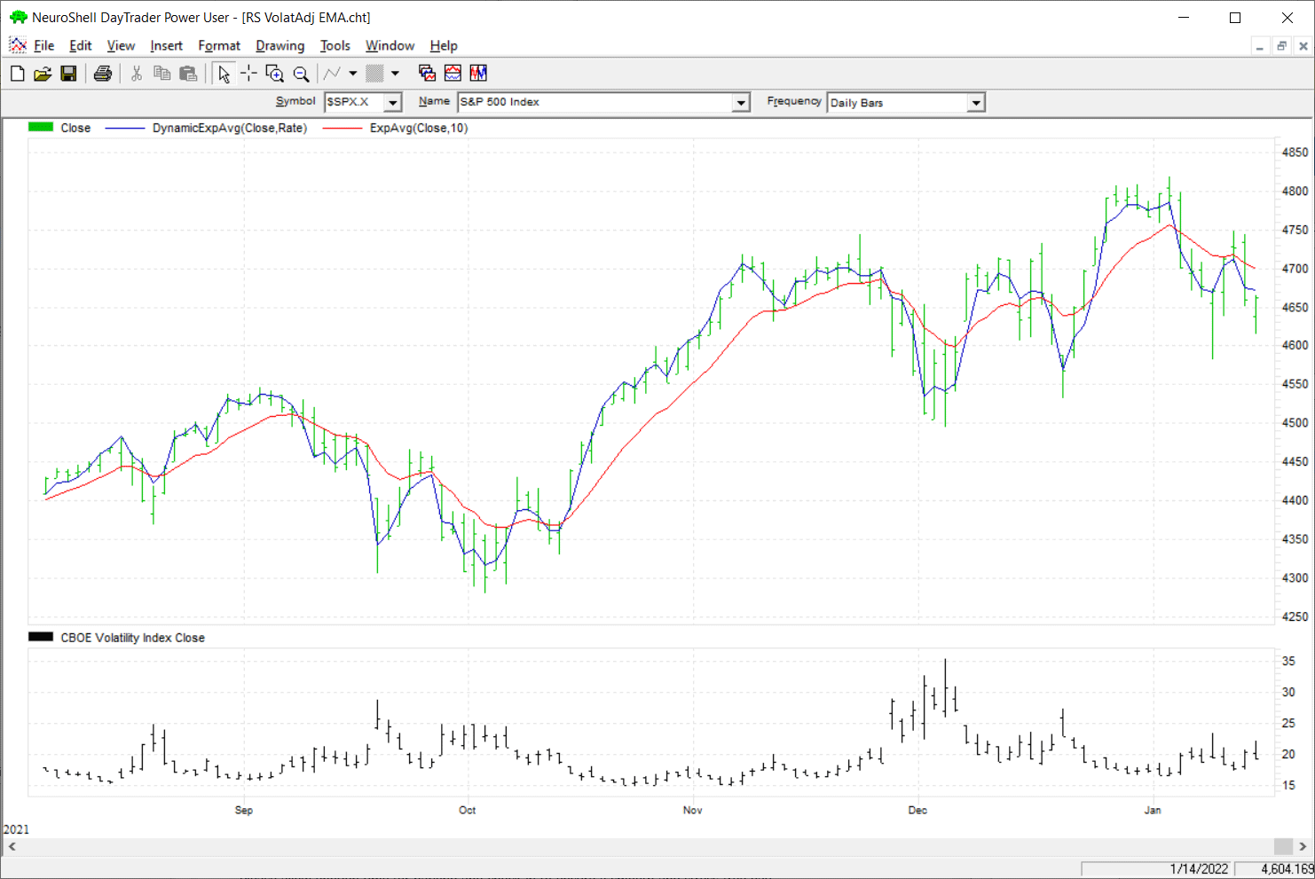 The exponential moving average (EMA) and the relative strength indicator (RSI) are both very popular indicators. In his article in this issue, “Relative Strength Moving Averages, Part 3: The Relative Strength Volatility-Adjusted Exponential Moving Average (RS VolatAdj EMA),” Vitali Apirine combines them. He measures the relative strength of a volatility index (VIX) and uses the result as an EMA time period.