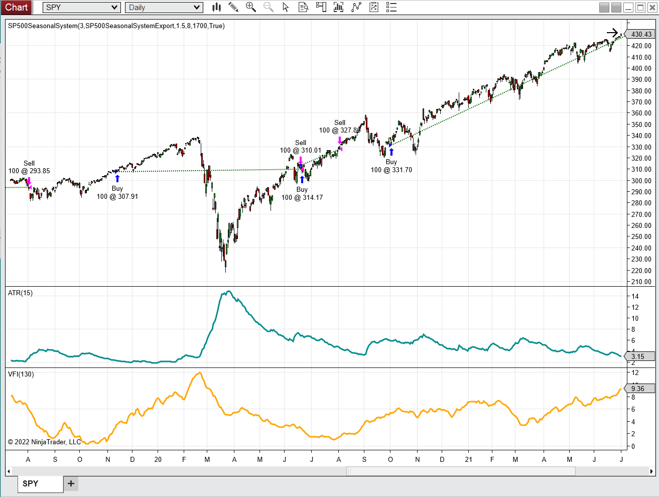 The VFI indicator and trading system can be downloaded from the 2022 script repository on https://financial-hacker.com. The Zorro software can be downloaded from https://zorro-project.com.