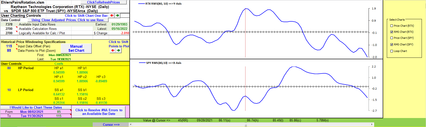 FIGURE 3: NINJATRADER. This shows an example of an Ehlers Loop pairs rotation of RTX versus SPY for four months in 2021. The loop plot starts on August 2nd.