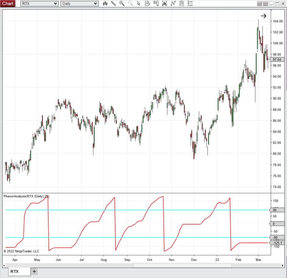 FIGURE 3: NINJATRADER. The phasor analysis(28) indicator set to the “phasor” plot type displayed on a daily Raytheon (RTX) chart from April 2021 to March 2022.