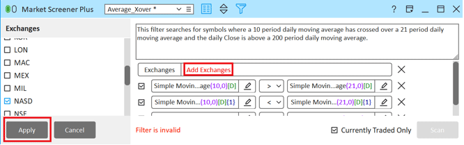 FIGURE 11: ESIGNAL. Click “add exchanges” to reveal a list of exchanges in the left panel. Choose the exchange you wish to scan, then click “apply.”