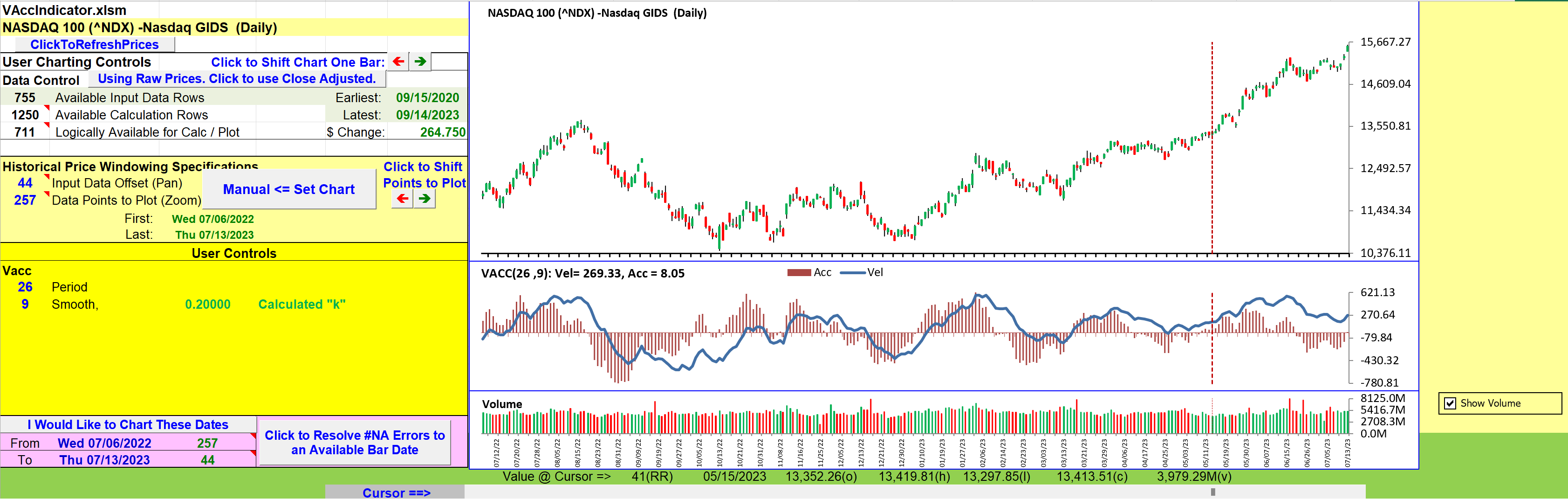 FIGURE 10: EXCEL. Here, the VAcc (26,9) along with velocity and acceleration are applied to a daily NASDAQ-100 chart. The pane at left shows some of the user controls.