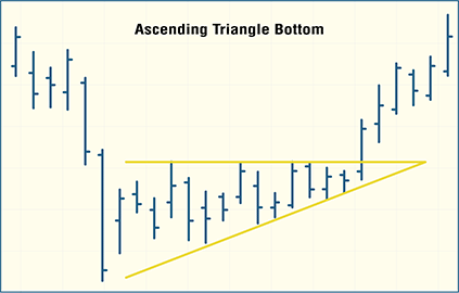 THE ASCENDING TRIANGLE BOTTOM. The triangle bottom is signaled by an ascending triangle in which a flat upper trendline and ascending lower trendline meet and compel prices within the two lines.