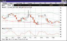 Daily, weekly, and intraday (one, five, 15, and 60 minutes) charts (Figure 2) come with the choice of 18 analysis techniques, all of which have been taken from Technical Analysis From A To Z by Steven Achelis of Equis International. This alleviates any problems with not knowing the definitions of the various techniques. Price data can be plotted using OHLC, HLC, candlestick, high bar, close line, dots, performance, and relative performance. Analysis techniques, such as Bollinger Bands, are overlaid on price, but those requiring their own scaling system replace the volume chart. Thus, you are limited to two charts, with as many overlays as you might want for the price chart, as long as the price scale is not affected. You can annotate either chart with multiple trends and adjust the trendlines by moving either end up or down or stretching, or shift the entire trendline. In addition, the charts are offered in three different color schemes.